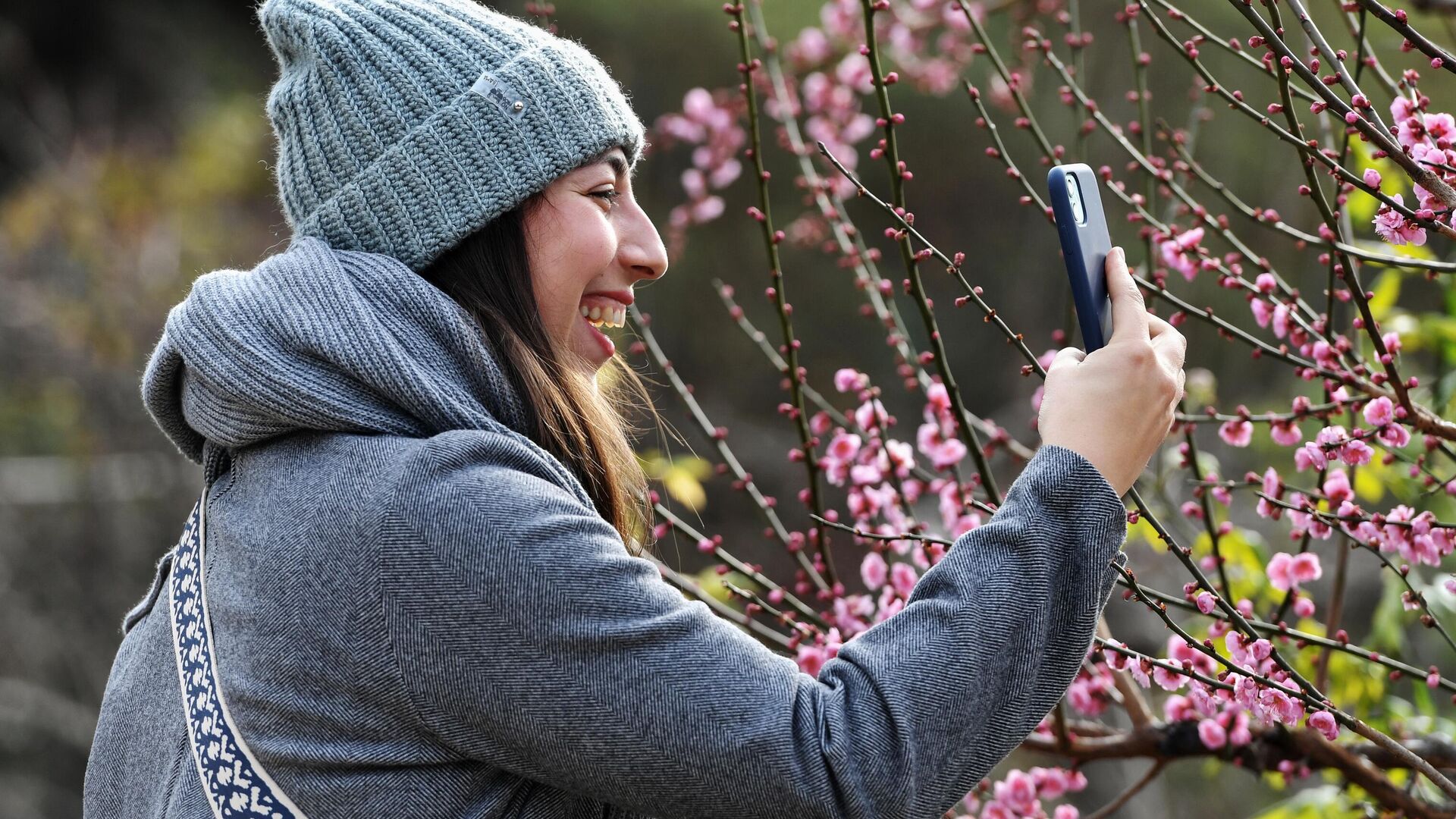 Девушка фотографирует цветы миндаля. Архивное фото Дзен
